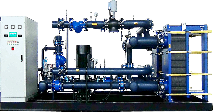 板式換熱機(jī)組,為換熱機(jī)組的一種型號,其特點(diǎn)是采用板式換熱器,在相同壓力損失情況下,其傳熱系數(shù)比管式換熱器高3-5倍,占地面積為管式換熱器的三分之一,熱回收率可高達(dá)90%以上。